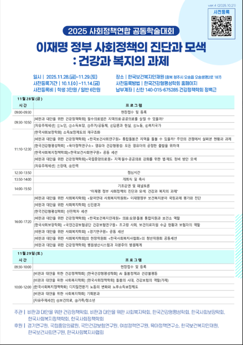 2025년 11월 28~29일(금, 토) 한국보건인재원에서 "이재명 정부 사회정책의 진단과 모색: 건강과 복지의 과제"의 주제로 열리는