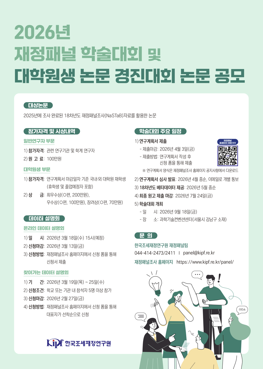 한국조세재정연구원에서는 ‘2026년 재정패널 학술대회 및 대학원생 논문 경진대회’를 개최하고자 우수한 연구논문을 아래와 같이 모집합니다. 관심 있는 연구자 여러분들의 많은 참여 바랍니다.