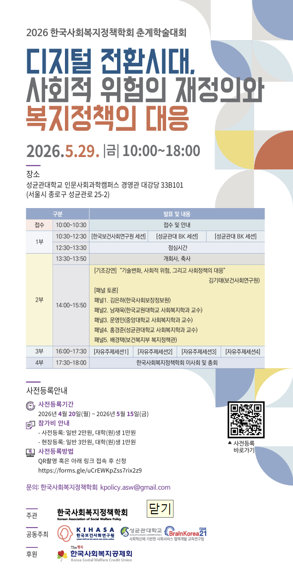 2026 사회복지정책학회 춘계학술대회를 아래와 같이 개최하고자 합니다.